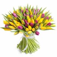 Нет более яркого и внушительного букета, чем композиция из 101-го тюльпана темно-розовых и желтых цветов. Перевязанные лентой, они несут весну своим внешним видом и запахом. Согласно флористам, тюльпаны значат грацию, молодость и яркую как солнце улыбку. Букет подойдет любимому человеку, близкому другу или коллеге, чтобы напомнить об их важности в жизни.